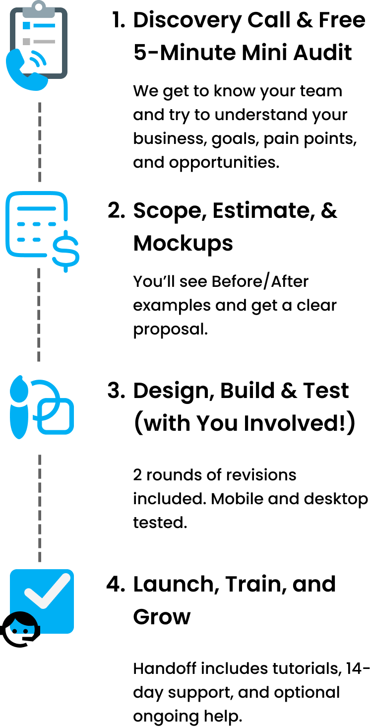 After your Free Discovery Call and Mini Audit, we’ll give you a clear, customized quote — no surprises. -